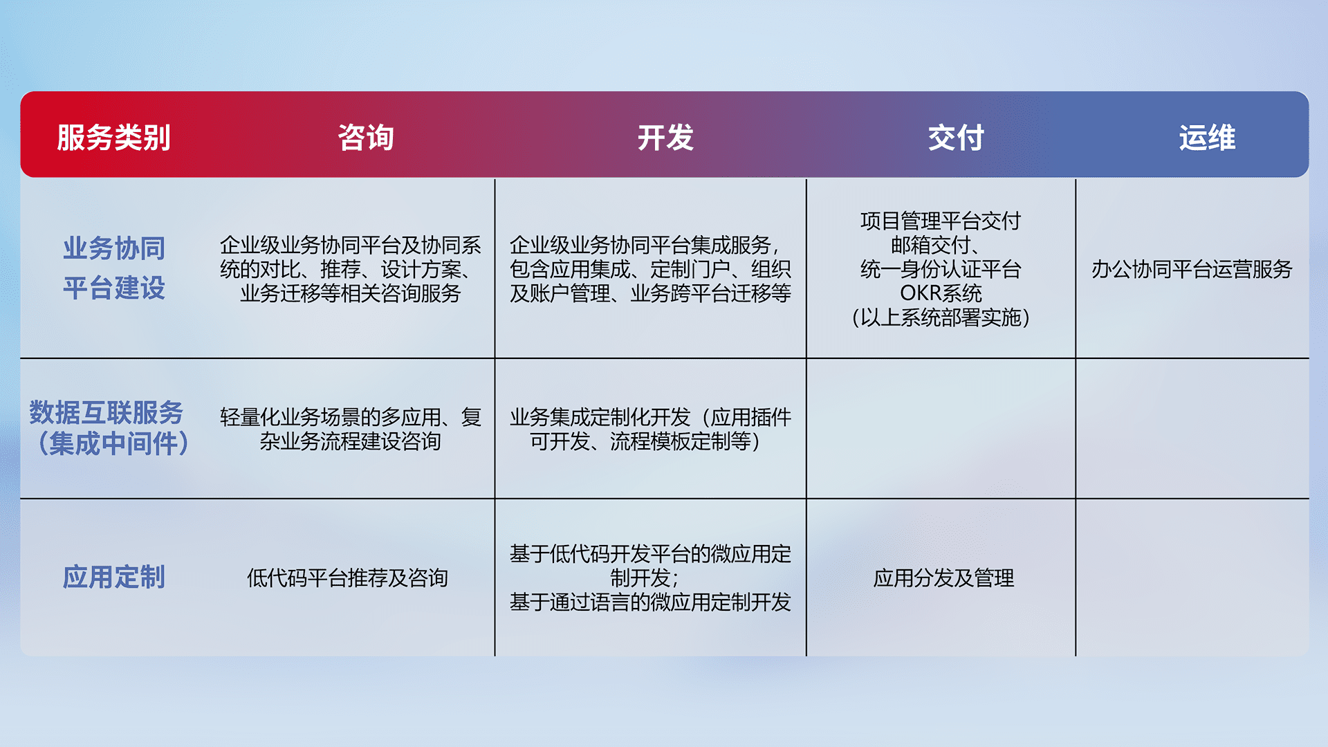 针对钉钉、、企微、、、IDaas等平台级产品提供产品的规划、、、、方案、、交付、、、、定制化开发等服务,,实现如统一协同办公、、、、智能客户服务、、、混合会议管理、、、智能数据查询、、、、等业务场景,,实现数字化转型。。